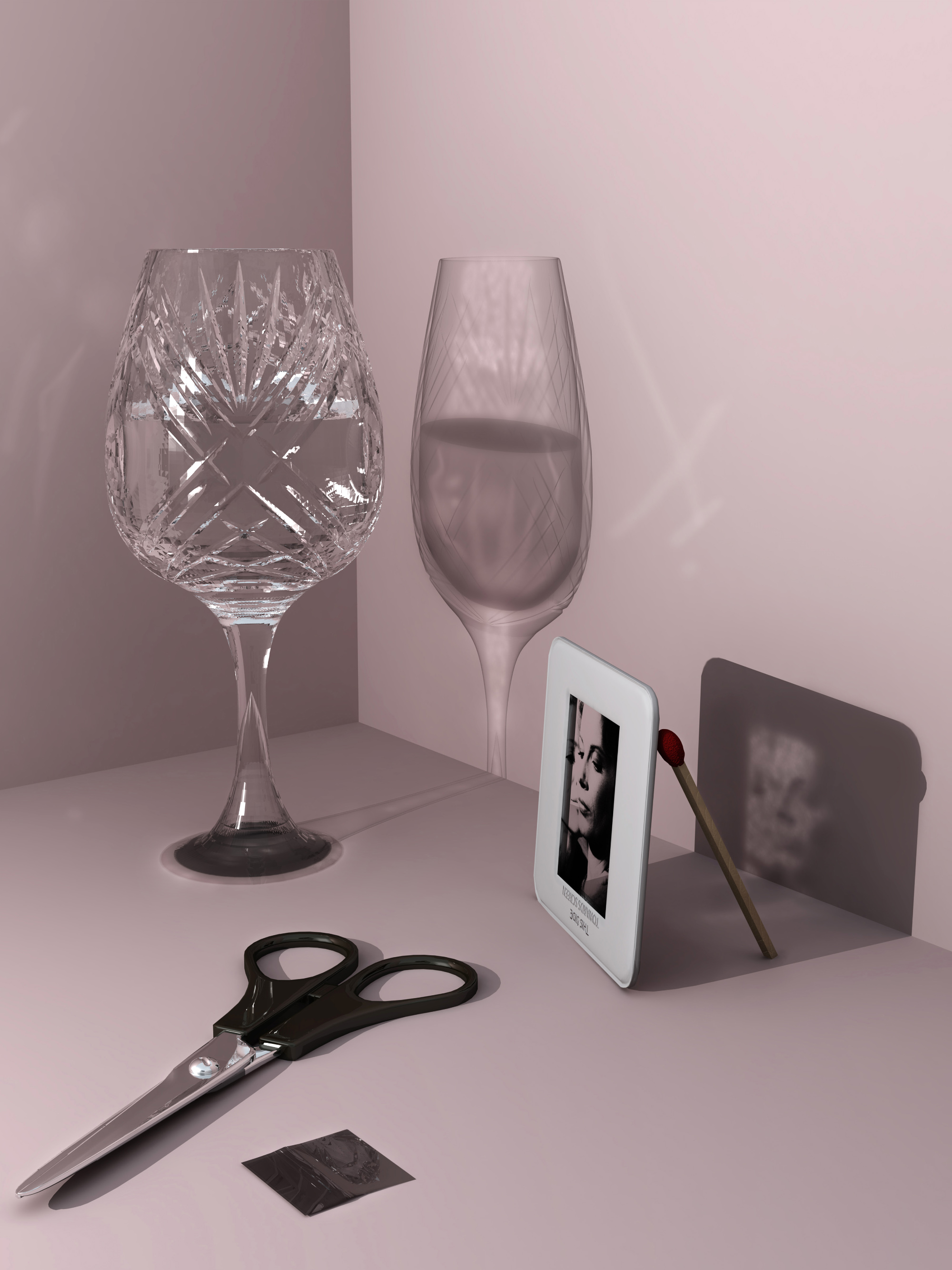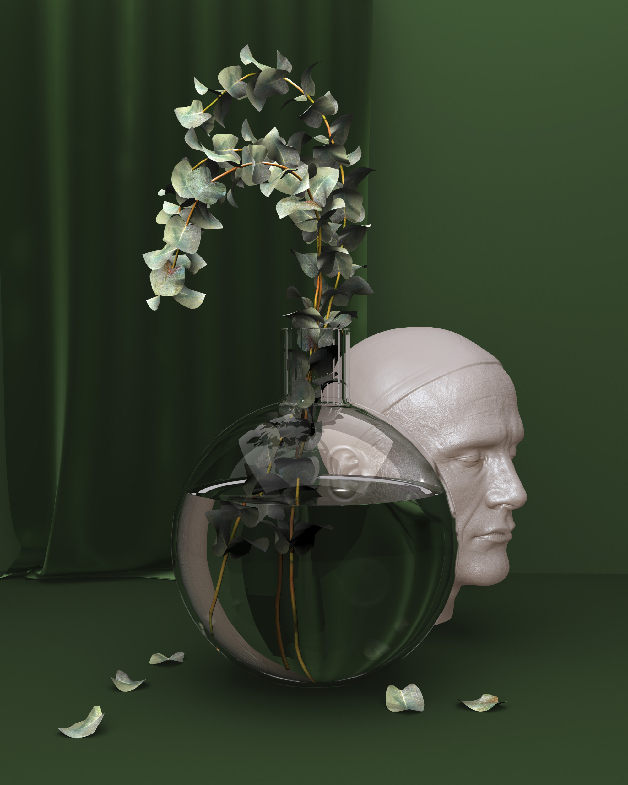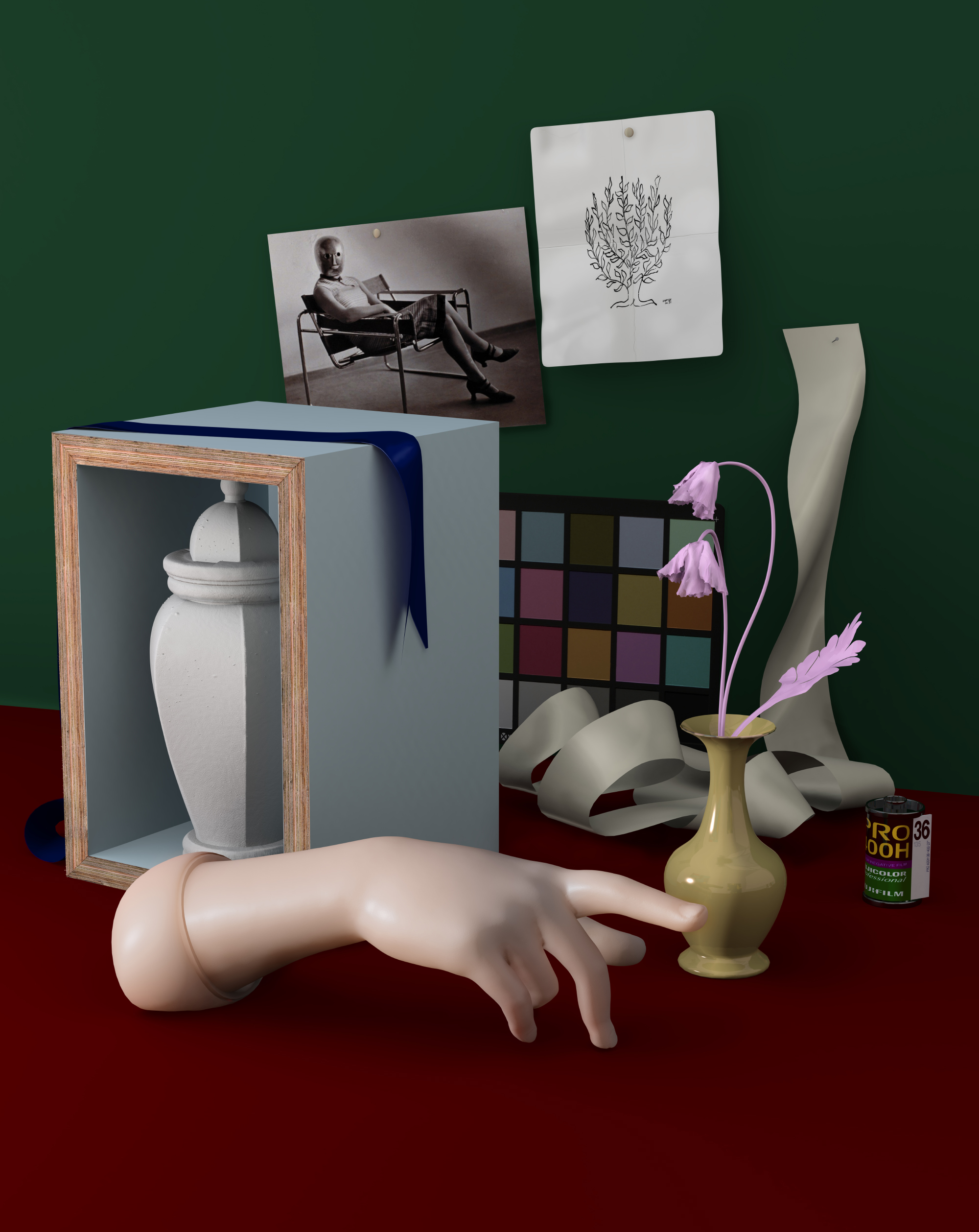 Works produced for ‘Everyday Topologies’ play with the tropes of still life painting and trompe l’oeil whilst reflecting the spatial anomalies of CGI. 3D computer models that signify traces of human presence are employed within paintings and digital prints to comment upon the aesthetic and economic associations between virtual and material life. A scan of an actor’s face, home décor items and painterly gestures hover within worlds unsure of their status as subject or object.