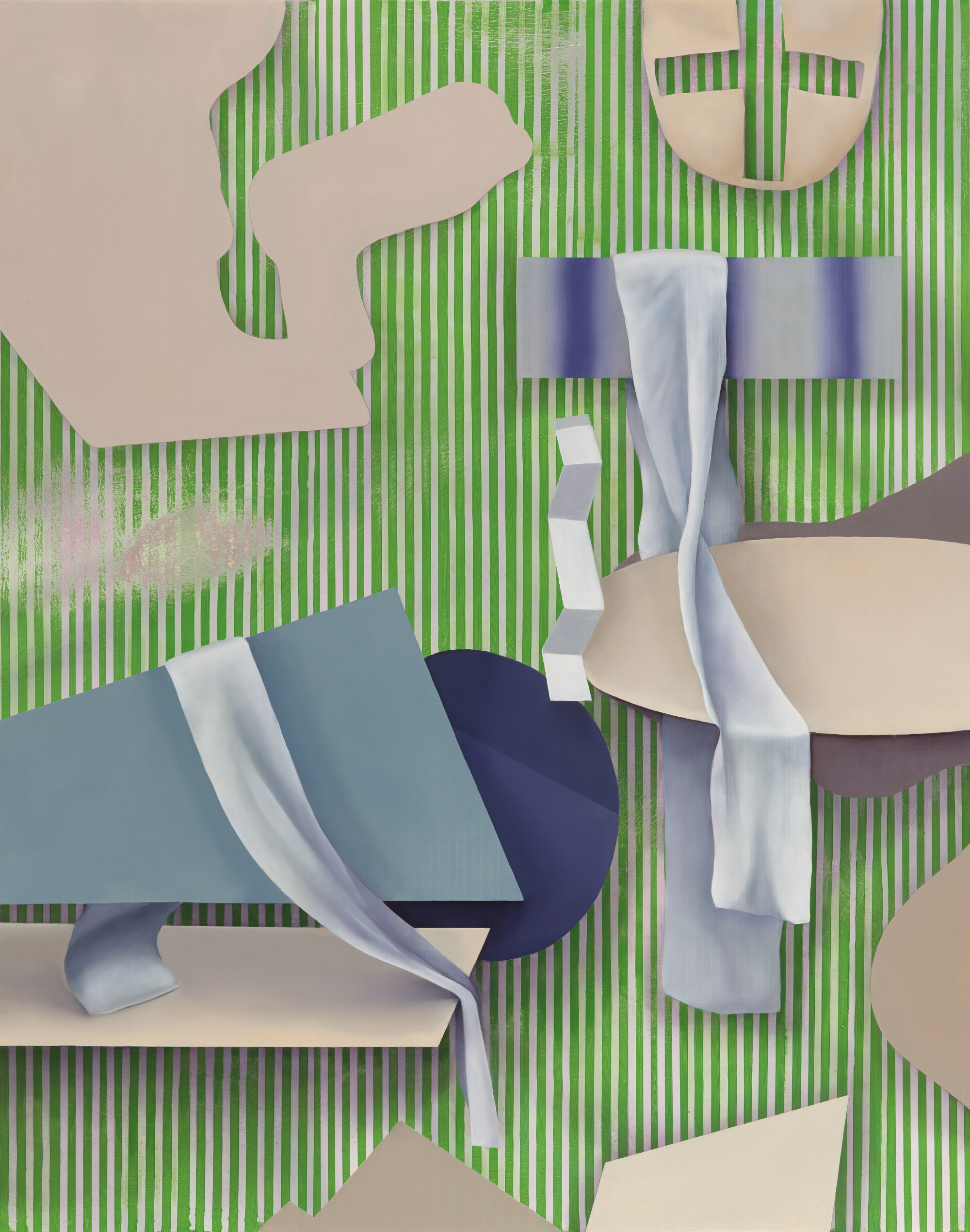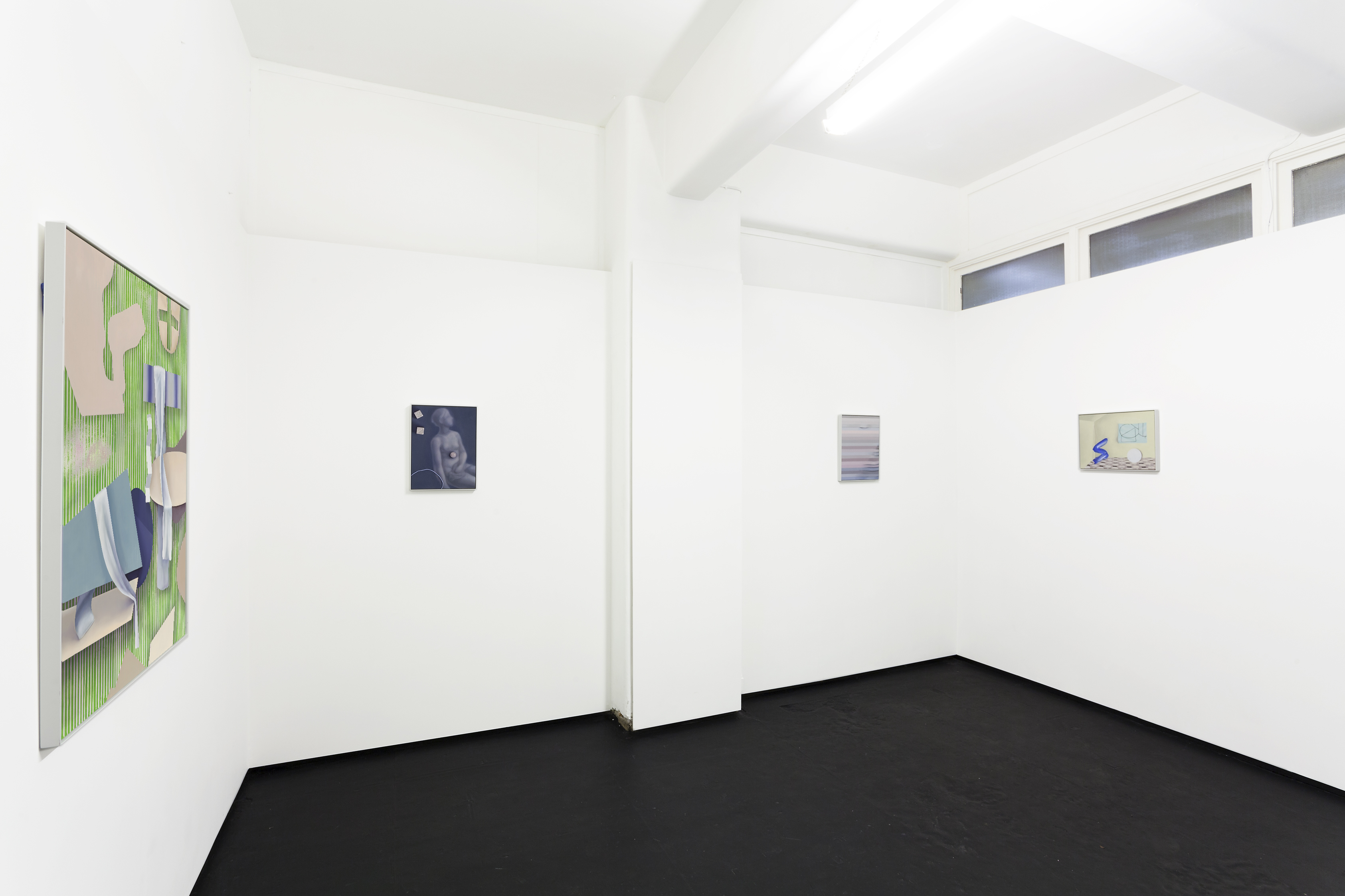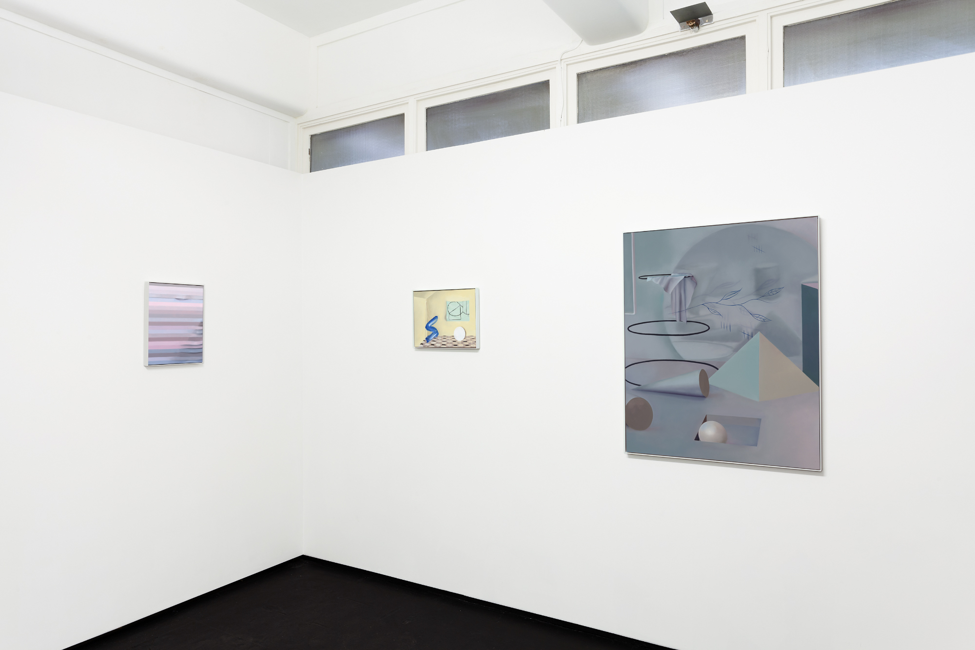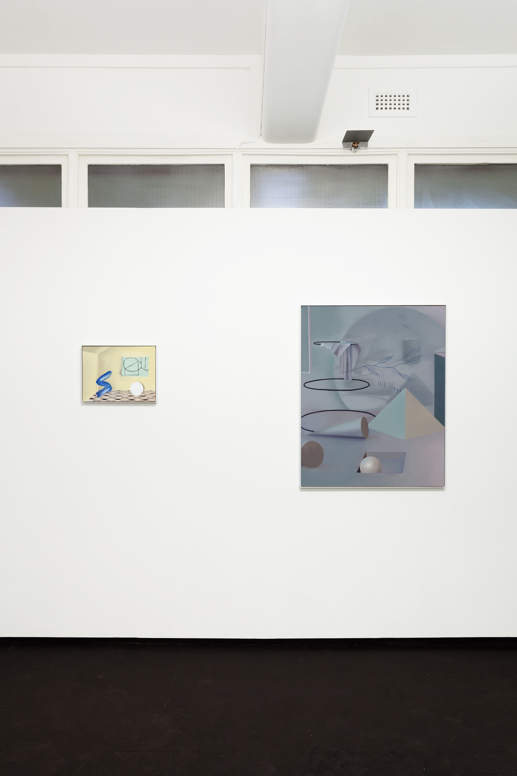 This body of paintings reflect upon virtual space and the precarious nature of the tools we use to navigate and describe it. In the digital realm, patterns of movement, consumerism and communication may be distilled, filtered, and analysed. Koops’ work considers how these metrics translate into forms and the manner in which these incomplete portraits are lodged within larger mosaics of information. 3D computer models similar to those found in CAD plans of apartments and IKEA product shots, are starting points for these works. These immaterial objects are then dragged backward through the analogue and material process of oil painting.
